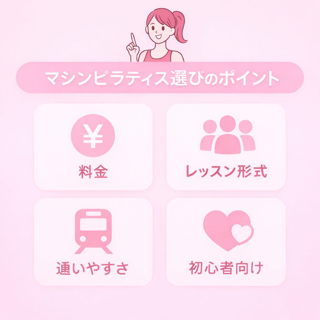そこで、ここでは、マシンピラティススタジオを選ぶポイントを詳しく解説します。